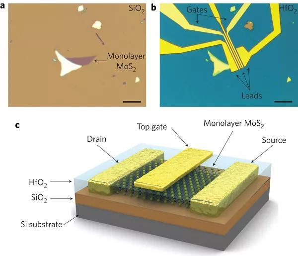 二維材料在下一代納米電子器件中的應用很有吸引力,因為與一維材料相比,用它來制造復雜的結構相對容易。研究最廣泛的二維材料是石墨烯,這是由于其具有豐富的物理性質(zhì)和高電子遷移率。但是,原始石墨烯不具有帶隙,而帶隙這一性質(zhì)對于包括晶體管在內(nèi)的許多應用都是必不可少的。設計石墨烯帶隙會增加制造復雜性,或者將遷移率降低到應變硅膜的水平,或者需要高電壓。盡管單層MoS2具有1.8 eV的大固有帶隙,但先前報道的在0.5-3 cm2·V-1·s-1范圍內(nèi)的遷移率對于實際設備而言仍然太低。此文中,作者使用氧化鉿柵極電介質(zhì)獲得了超過200 cm2·V-1·s-1的室溫單層MoS2遷移率,接近石墨烯納米帶,并展示了電流開/關比為1×108,待機功耗極低的室溫晶體管。由于單層MoS2具有直接的帶隙,因此可用于構造帶間隧場效應晶體管,與傳統(tǒng)晶體管相比,其功耗更低。單層MoS2還可以在需要薄透明半導體的應用中補充石墨烯,例如光電子學和能量收集領域。