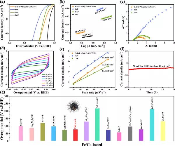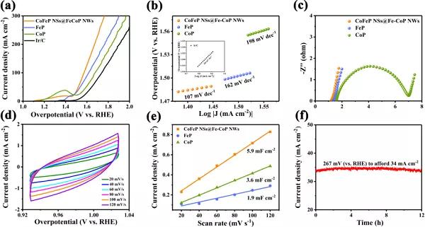 a)CoFeP NSs@Fe-CoP NWs樣品的極化曲線圖;b)CoFeP NSs@Fe-CoP NWs樣品的塔菲爾斜率圖;c)CoFeP NSs@Fe-CoP NWs樣品的阻抗圖譜;d)CoFeP NSs@Fe-CoP NWs樣品在不同速率下的CV曲線圖;e)CoFeP NSs@Fe-CoP NWs樣品的電流密度隨掃描速率的變化;f)CoFeP NSs@Fe-CoP NWs樣品在恒電位下的耐久性測(cè)試圖;g)CoFeP NSs@Fe-CoP NWs與Fe/Co基催化劑的HER活性對(duì)比圖。圖4. 2D/1D CoFeP NSs@Fe-CoP NWs催化劑在堿性電解質(zhì)中OER的電化學(xué)表征