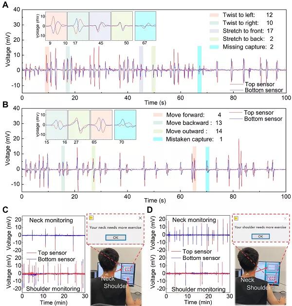 研究人員進(jìn)一步將具有兩層壓電復(fù)合材料的傳感器貼到人的手掌上,便可通過分析上下兩層傳感器的壓電輸出,解耦得到手掌的彎曲幅度和彎曲方向(如圖4所示)。另一方面,當(dāng)這種傳感器被貼到頸椎和肩關(guān)節(jié)上時(shí),上下兩層傳感器傳出的不同信號(hào)也能被用來分析頸椎和肩關(guān)節(jié)的運(yùn)動(dòng)模式,比如判斷頸椎是左右扭動(dòng)還是前后擺動(dòng)(如圖5所示)。在此基礎(chǔ)上,研究人員建立了一套關(guān)節(jié)運(yùn)動(dòng)監(jiān)測(cè)和警報(bào)系統(tǒng),在半個(gè)小時(shí)的監(jiān)測(cè)中,這套系統(tǒng)不光能判斷人體頸椎和肩關(guān)節(jié)的運(yùn)動(dòng)情況,而且還能根據(jù)不同情況對(duì)哪些部位缺乏運(yùn)動(dòng)進(jìn)行警告,從而避免長(zhǎng)時(shí)間久坐帶來的各種關(guān)鍵疾?。ㄈ鐖D6所示)。