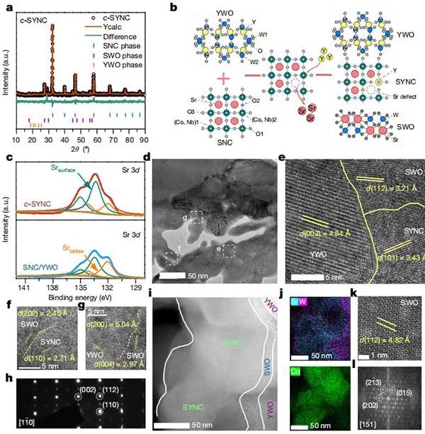(a)c-SYNC復(fù)合粉末的XRD圖譜及精修;(c)煅燒前c-SYNC和“原始” SNC/YWO的Sr 3d軌道的XPS圖譜;(e-g)YWO,SWO和SYNC相界面的HR TEM圖像;(h)f中SYNC相的[110]區(qū)域軸的SEAD模式;(j)相對(duì)應(yīng)的元素Sr,W映射;(k,l)STEM圖像和相應(yīng)的SWO相FFT圖像。圖二、c-SYNC的熱膨脹行為及相應(yīng)的電化學(xué)性能