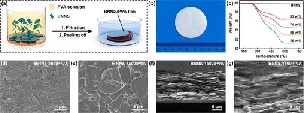 (a)抽濾制備BNNS/PVA復(fù)合薄膜的過程示意圖。(b)復(fù)合薄膜實物照片及其(c) TGA曲線。83 wt%含量下(d) BNNS-1000/PVA和(e–g) BNNS-1500/PVA的表面和橫截面SEM圖像。