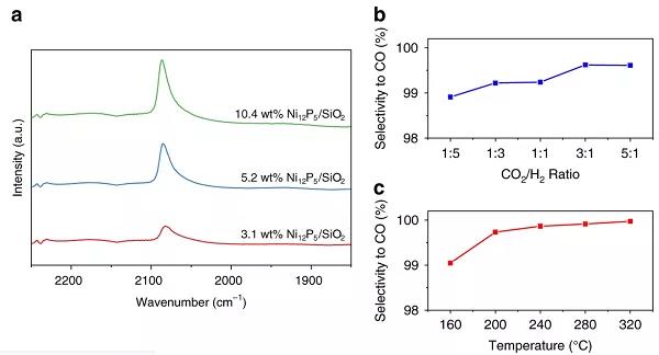 近期,中山大學(xué)匡代彬教授和多倫多大學(xué)Geoffrey A. Ozin教授(共同通訊作者)首次報道了金屬磷化物可作為一種高活性、選擇性、穩(wěn)定性的光催化二氧化碳加氫催化劑。研究以磷化鎳(Ni12P5)為原型,這一磷化物的結(jié)構(gòu)建立在將高分散鎳納米簇集成到磷晶格中的基礎(chǔ)上,可以在整個太陽光光譜范圍高度富集光能。由于該化合物具有獨特的線性鍵合的鎳-羰基占主導(dǎo)的反應(yīng)路徑,磷化鎳被發(fā)現(xiàn)是一種光熱催化劑,可實現(xiàn)逆水煤氣變換反應(yīng),一氧化碳的生產(chǎn)速率為960?±?12?mmol?gcat?1?h?1,選擇性近乎100%,同時還具有長期穩(wěn)定性。不僅如此,磷化鈷也被發(fā)現(xiàn)具有相似的特性,這說明金屬磷化物可作為具有高速率和選擇性的光熱二氧化碳催化劑。