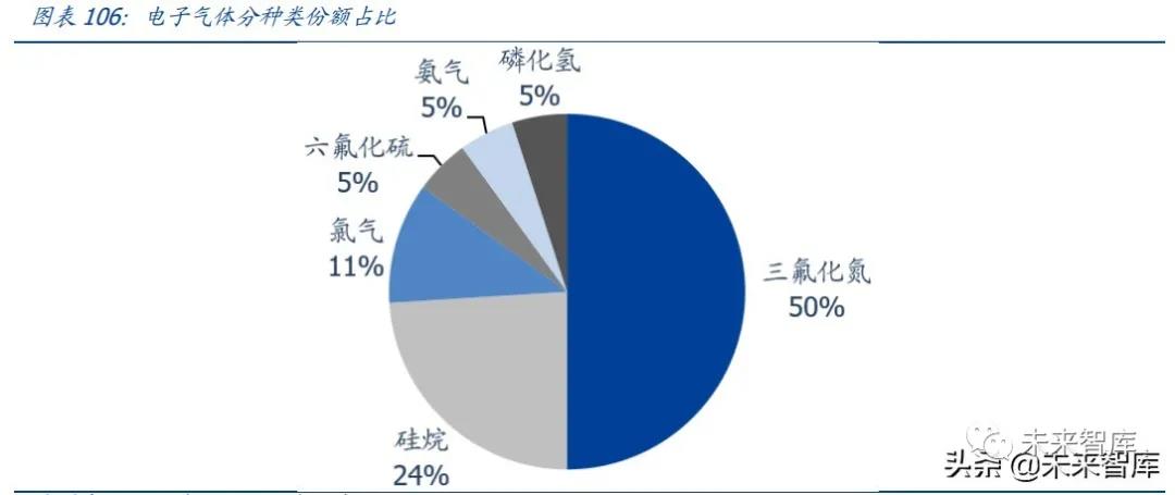 在顯示面板產(chǎn)業(yè)中,在薄膜工序中需要通過化學(xué)氣相沉積在玻璃基板上沉積薄膜,需要 使用 SiH4、PH3、NF3 、NH3 等。在干法蝕刻工藝中,需要在等離子氣態(tài)氛圍中選擇性 腐蝕基材,需要用到 SF6、HCl、Cl2 等;在 LED 產(chǎn)業(yè)中,外延技術(shù)需要高純電子特氣包 括高純砷烷、高純磷烷、高純氨氣,HCl和Cl2常常用做蝕刻氣;在太陽能光伏產(chǎn)業(yè)中, 晶體硅電池片生產(chǎn)中的擴(kuò)散工藝需要用到 POCl3,減反射層等 PECVD 工藝需要用到 SiH4、 NH3,蝕刻需要用到 CF4。薄膜太陽能電池在沉積透明導(dǎo)電膜工序中需要用到 B2H6等。