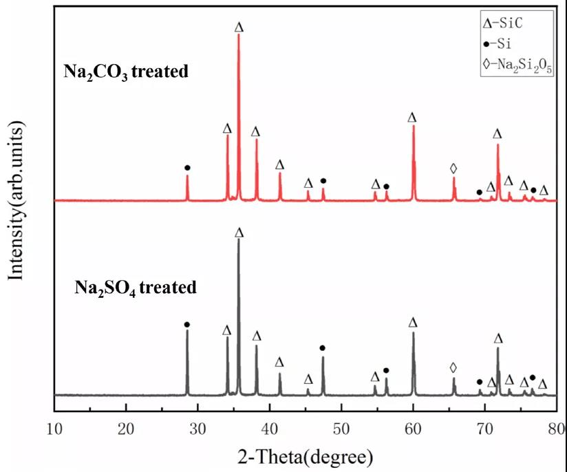 圖 2 Na2CO3 和 Na2SO4 熔鹽 900℃處理 4 h 的 SiC 陶瓷表面 XRD 圖譜