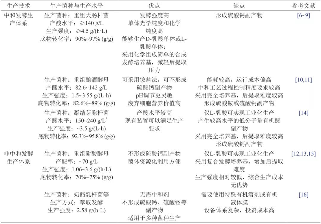 ②非中和發(fā)酵生產(chǎn)體系,主體采用耐酸性酵母生產(chǎn)菌株進(jìn)行乳酸單體的生產(chǎn),優(yōu)點是不形成硫酸鈣副產(chǎn)物,但乳酸單體的生產(chǎn)強(qiáng)度和生產(chǎn)水平均偏低,需要特殊的發(fā)酵生產(chǎn)裝備且發(fā)酵過程能耗和輔助原料的消耗也顯著加大。該技術(shù)現(xiàn)為個別國際企業(yè)采用,應(yīng)用于 L- 乳酸單體的發(fā)酵生產(chǎn)。此外,采用特殊生產(chǎn)工藝(如在位萃取方法)可消除石膏或硫酸銨等副產(chǎn)物的形成,但工業(yè)生產(chǎn)效率和經(jīng)濟(jì)效益有待進(jìn)一步提升。