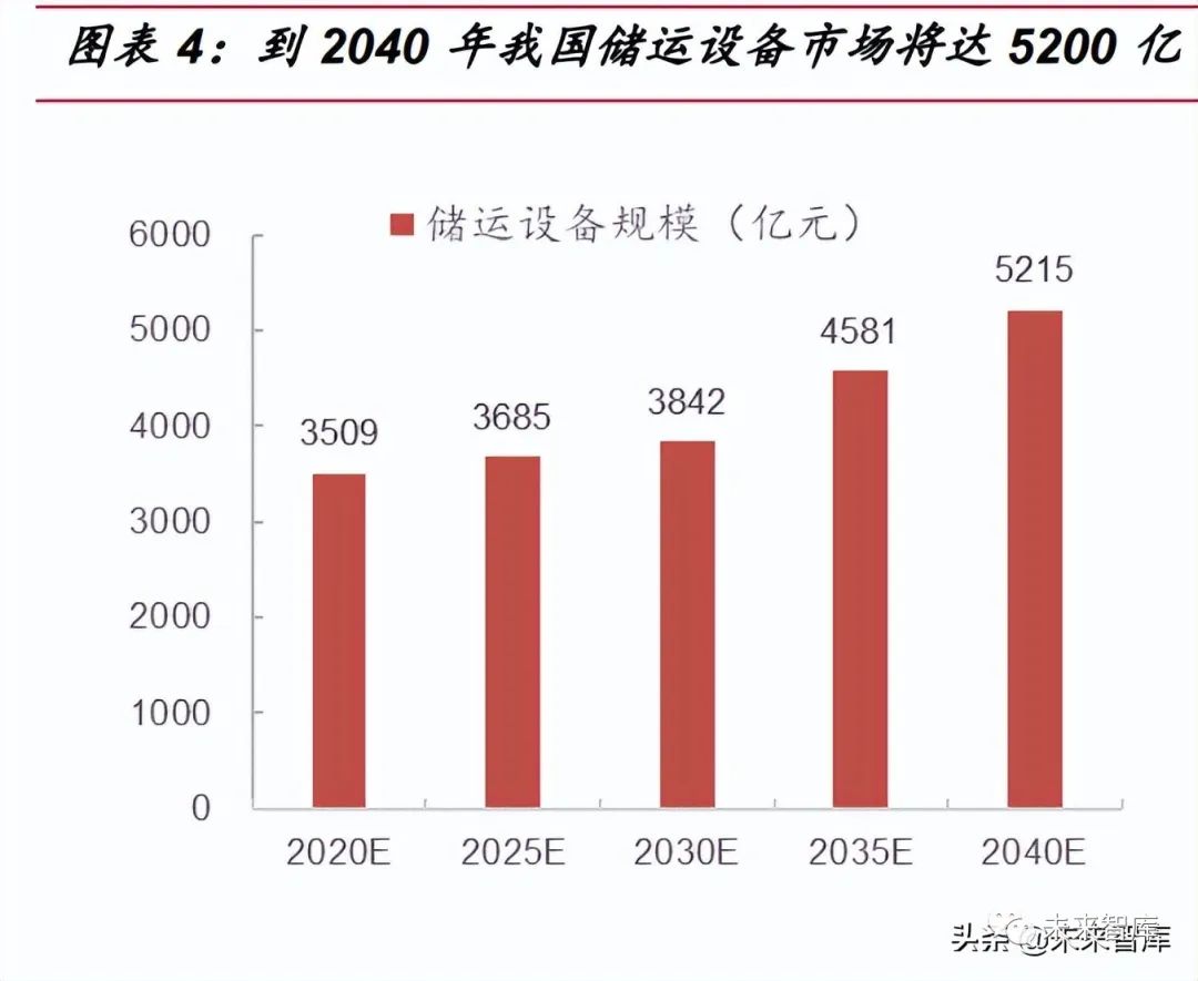 龐大的氫能需求需依靠完善的氫儲(chǔ)運(yùn)供應(yīng)鏈,將帶來(lái)千億級(jí)設(shè)備投資規(guī)模。在 氫能行業(yè)深度報(bào)告系列二中,我們?cè)敱M分析了氫能在工業(yè)、交通、建筑等領(lǐng)域參與深 度脫碳的潛力,即在 2060 碳中和目標(biāo)下,據(jù)中國(guó)氫能聯(lián)盟預(yù)測(cè),到2040 年,我國(guó) 氫氣的年需求量將增至 5700 萬(wàn)噸左右,龐大的氫能需求量需依靠完善的氫儲(chǔ)運(yùn)供應(yīng) 鏈。假設(shè)按照終端氫氣售價(jià) 30 元/kg,儲(chǔ)運(yùn)成本占比 30%,設(shè)備投資成本占比 70%, 對(duì)應(yīng)儲(chǔ)運(yùn)設(shè)備市場(chǎng)規(guī)模將達(dá) 5200 億元。
