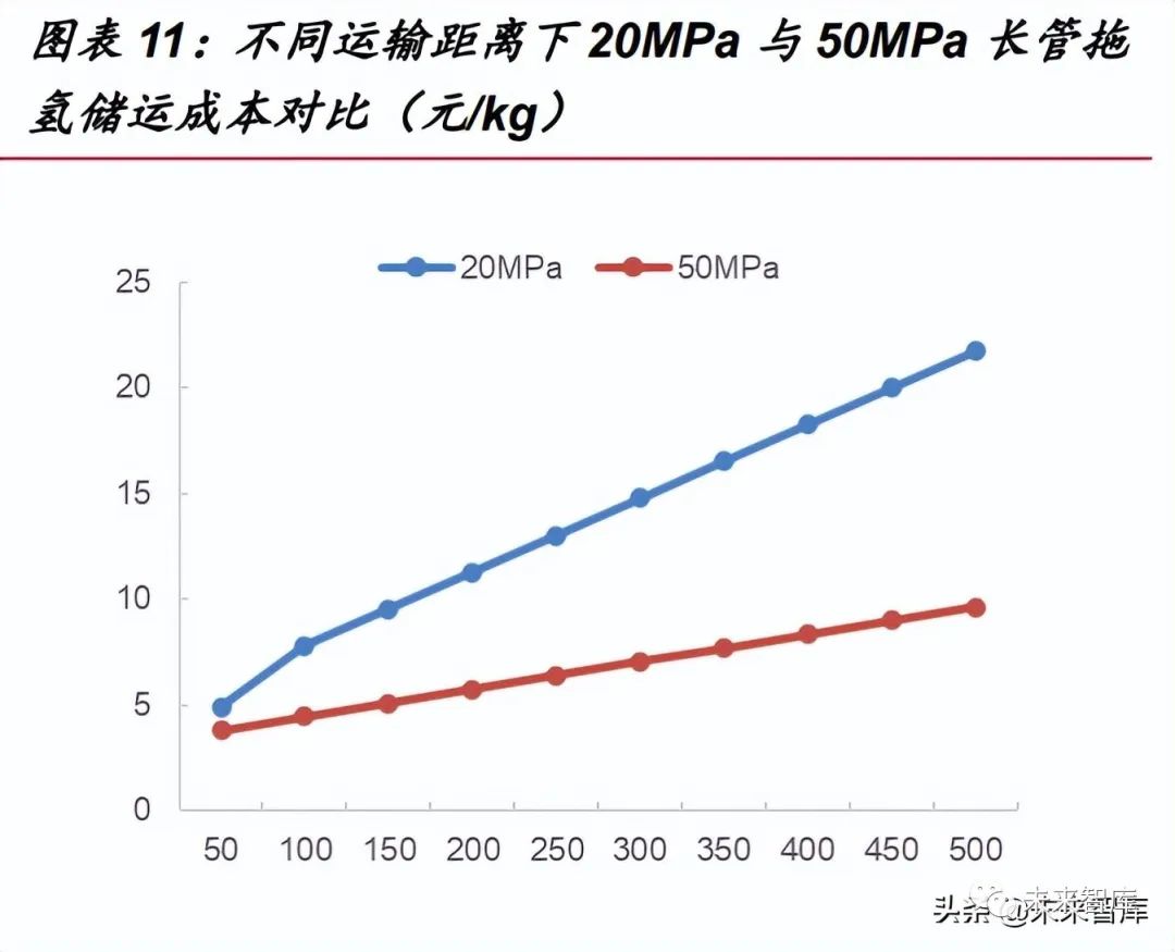 據(jù)中石油化工研究院數(shù)據(jù),當(dāng)運(yùn)輸距離為 50km 時(shí),氫氣的運(yùn)輸成本為 4.9 元/kg; 隨著運(yùn)輸距離的增加,長(zhǎng)管拖車運(yùn)輸成本逐漸上升,當(dāng)距離 500km 時(shí)運(yùn)輸成本近 22 元/kg,所以考慮到經(jīng)濟(jì)性問(wèn)題,長(zhǎng)管拖車運(yùn)氫一般適用于 200km 內(nèi)的短距離和運(yùn)量 較少的運(yùn)輸場(chǎng)景。此外可以看出,隨著距離增加,20MPa 和 50MPa 運(yùn)輸條件下的成 本逐漸分化,50MPa 下的成本優(yōu)勢(shì)越來(lái)越明顯,當(dāng)運(yùn)輸距離為 200km 時(shí),其成本差 距約 4 元/kg。實(shí)際上,超過(guò) 200km 的運(yùn)輸距離將導(dǎo)致拖車及人員配置冗雜的問(wèn)題。