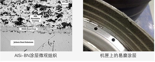 易磨涂層(Abradable Coating),是發(fā)動機(jī)葉尖封嚴(yán)系統(tǒng)的一部分,也叫“封嚴(yán)涂層”。通常應(yīng)用于機(jī)匣零件中的跑道面,主要作用是減少葉尖碰磨損傷。由于易磨涂層需要跟葉尖進(jìn)行對磨,為了保護(hù)葉尖,易磨涂層一般硬度小,結(jié)合力差,從而能夠保證葉尖在大服役狀態(tài)碰上時(shí),能夠有效地刮削涂層。