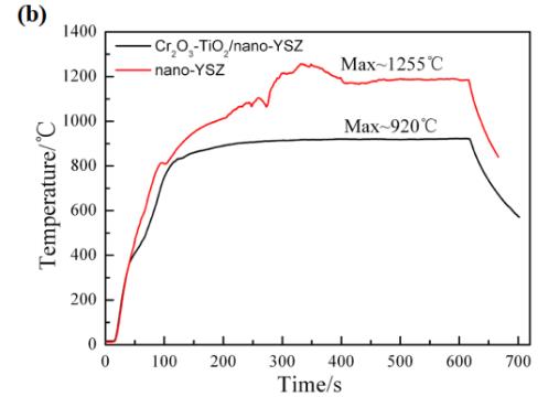 圖 9 Cr2O3-TiO2/nano-YSZ 復(fù)合涂層和納米 YSZ 涂層燒蝕過程中:(a) 表面溫度曲線;(b) 背部溫度曲線