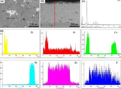 圖 10 Cr2O3-TiO2/nano-YSZ 復(fù)合涂層燒蝕后: (a) 表面形貌; (b) 截面形貌; (c) 點掃描; (d) 線掃描