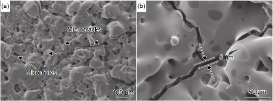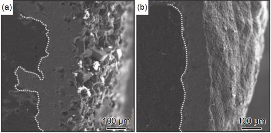 雖然包埋法制備 SiC 涂層的技術(shù)具有明顯的優(yōu)勢(shì),但是此方法仍存在以下缺點(diǎn):(1)包埋 SiC 涂層由于制備溫度高、反應(yīng)時(shí)間長(zhǎng),具有較大的表面粗糙度;(2)在包埋過程中,C/C 復(fù)合材料被熔融的液態(tài)硅硅化,會(huì)對(duì)薄壁件的力學(xué)性能造成嚴(yán)重的破壞;(3)由于重力因素,涂層的均勻性和厚度控制難。為了解決上述問題,Zhou 等首先采用料漿噴涂與熱處理炭化的方法制備多孔 SiC 預(yù)涂層,該預(yù)涂層可以在一定程度上防止硅擴(kuò)散至基材,減少硅在高溫下對(duì) C/C 復(fù)合材料的侵蝕。然后引入氣相滲硅工藝,利用氣態(tài)硅在多孔預(yù)涂層中的浸滲填充與化學(xué)反應(yīng),形成致密的涂層(GSI-SiC-Si)。試樣在 1773 K 至室溫的熱震實(shí)驗(yàn)中經(jīng)受 30 次循環(huán)后,與常規(guī)包埋 SiC 涂層(PC-SiC-Si)相比裂紋尺寸明顯減少(圖 2),而且有 0.07% 的增重,在 1773 K氧化 500 h 后有 0.25% 的增重,表現(xiàn)出優(yōu)異的抗氧化性能。Miranda 等通過高速溶液等離子體噴涂工藝(HVSPS)在 C/C 復(fù)合材料表面制備了 SiO2/SiC梯度涂層,利用 SiO2 玻璃在高溫下的自愈合特性提高了涂層的抗氧化能力。