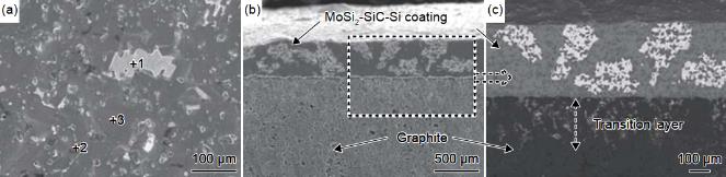 Jiang 等通過料漿浸漬在石墨表面制備出MoSi2-SiC-Si 涂層,然后采用氣相滲硅技術(shù)使之形成致密的涂層結(jié)構(gòu)(圖 4)。實(shí)驗(yàn)結(jié)果顯示,在室溫至 1600 ℃ ,涂層始終呈現(xiàn)出良好的抗氧化效果,1600 ℃ 氧化 220 h 后試樣失重為 0.96%。并在涂層中加入了 CrSi2 相,制備了 MoSi2- CrSi2-SiCSi 涂層。氧化過程中形成了氧擴(kuò)散系數(shù)較低的氧化層且氧化層中有分散的 MoSi2 和 CrSi2 相 , 在1600 ℃ 氧化 1190 h 后有 1.64% 的增重。