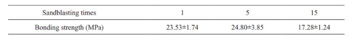 熱噴涂過程會釋放大量熱量,為了保證測試數(shù)據(jù)的準(zhǔn)確性,選擇了 Φ20× 8 mm 的鋁合金試樣作為基體,避免高溫變形,制備出表面平整的涂層體系。每種條件制備五組抗拉結(jié)合強度樣品,對測試結(jié)果取平均值,結(jié)果如表 3 所示。1 次噴砂和 5 次噴砂后的涂層結(jié)合強度均大于 23 MPa,表現(xiàn)出良好的結(jié)合力,且二者之間差異較低,可以看出噴砂 1 次已經(jīng)可以達到較好的界面結(jié)合,通過增加噴砂次數(shù)或延長噴砂時間顯然無效。在一些工況下,去除破壞區(qū)域后重復(fù)噴砂,也能達到初次噴砂的效果。當(dāng)噴砂次數(shù)達到 15 次以后,結(jié)合強度降低,僅有17.28 MPa,盡管從前面的結(jié)果來看,其表面粗糙度更高??赡艿脑蚴嵌啻螄娚昂?,試片邊緣位置出現(xiàn)了較多的損耗,導(dǎo)致試片中心位置略微突起,使得結(jié)合強度測試結(jié)果偏低。因此,從實際應(yīng)用的角度來說,噴砂次數(shù)超過 5 次以后,除了需要關(guān)注其涂層表面粗糙度塑性變形, 還需要關(guān)注不同位置的噴砂損耗, 保持表面狀態(tài)的一致性。