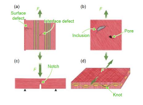 SiC/SiC 復合材料從損傷發(fā)生到最終破壞主要經歷基體橫向開裂、層間開裂、纖維束與基體分離、纖維束內基體開裂、纖維斷裂與拔出等損傷模式。裂紋萌生、擴展直至發(fā)生破壞的方式同纖維預制體結構或鋪層方式、界面層的類型及其與纖維和基體的結合強度、基體缺陷等密切相關。表面和界面缺陷、內容物和孔洞、人工狹縫或缺口尖端、編織結節(jié)等應力集中部位容易成為裂紋萌生點,如圖 2 所示。由于缺陷的廣泛存在,基體裂紋往往在比例極限以下即可發(fā)生;但是在很低應力水平下發(fā)生的基體裂紋并不一定直接影響材料的性能。